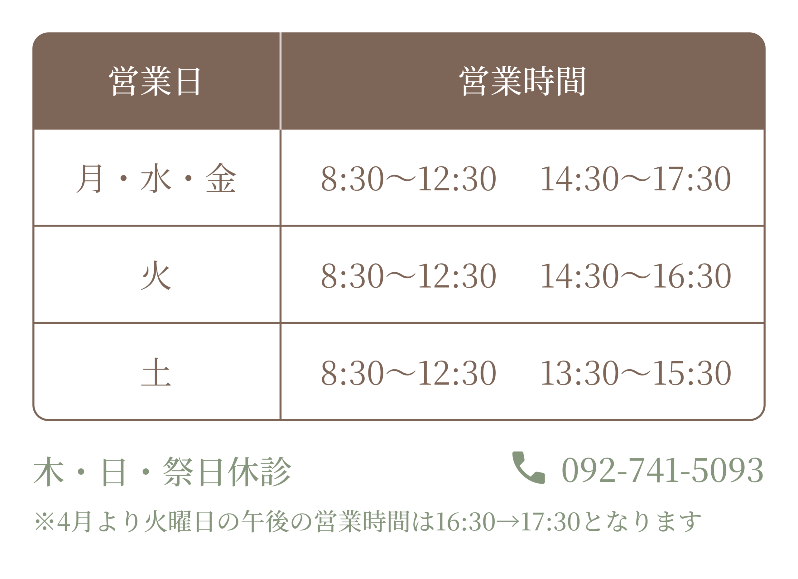 ※4月より火曜日の午後の営業時間は16:30→17:30となります